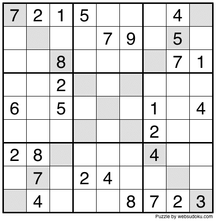 Instructions: Complete Sudoku-X like a regular Sudoku, but with no repeats in the shaded diagonals.